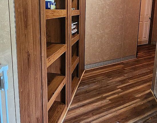 Built in shelves in hallway.