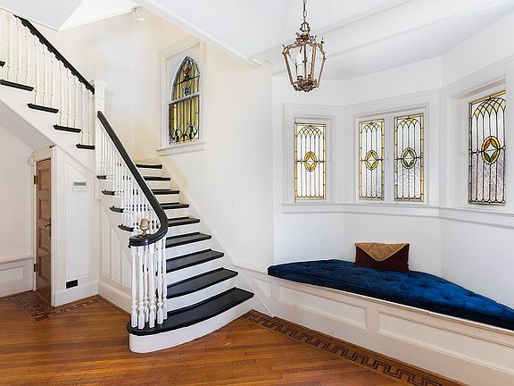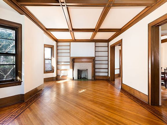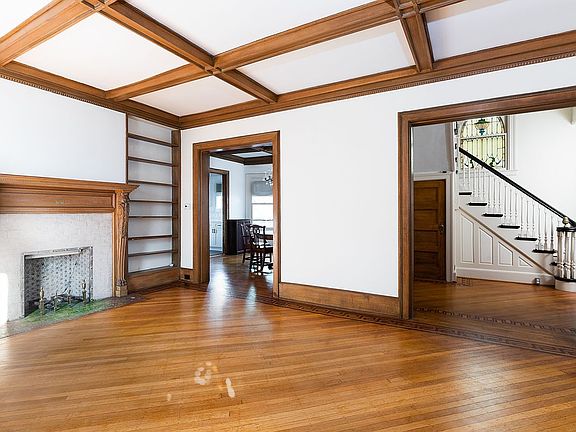 This home is timeless and was built to entertain. The front entry has a built-in window seat with four lovely stained-glass windows. Four archways off the entryway create an open floor plan with easy flow throughout the first floor. There are two spacious and grand living rooms with high ceilings and windows. The second living room features a coffered ceiling and a large original wood fireplace flanked by bookcases. The formal dining room has coffered ceilings and leads right into your newly renovated kitchen which is a culinary delight, Fully renovated with all new Frigidaire Appliances - which includes a 36 inch stove. The bright and airy kitchen has a half bathroom with laundry.