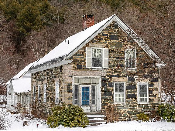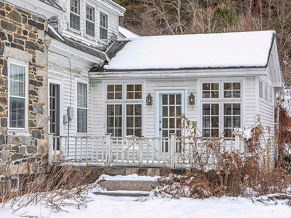 The Simeon Sherwin House, built in 1844, is one of three look-alike houses known as "Three Sisters". The house was owned by Olivia Goldsmith in the 1990's who wrote The First Wives Club. Her worldly, vibrant imprint is still evident in many of the home's unique features. Architecturally, the stone exterior is unique with large blocks (quoins) of schist and mica at the corners. Inside, there is a delightful three season sunroom and formal dining room with woodstove insert, chandelier and an array of full light doors which open to the large, bright kitchen and first floor full bath. A sitting room with a double-sided fireplace connects to the spacious living room. The inviting foyer leads to the second floor which features 3 bedrooms, 2 baths and a sitting room. An addition added by the author and named the Queen's Room during the current owners bnb tenure features built-ins, a partition wall with transom window and a wood stove insert flanked by cozy built-in seats. The primary bath features gold-plated fixtures, a skylight and soaking tub. The first floor also has a heated, retail space for a home business with a separate entrance and office above that has served as an antique shop. The two-car attached, garage has unfinished, overhead space. The exterior needs some sprucing up and a new owner will want to add cosmetic upgrades. The property on .70 acres has a lovely yard with a hydrangea bush, charming bridge, small pond and stone bench overlooking the picturesque village.
