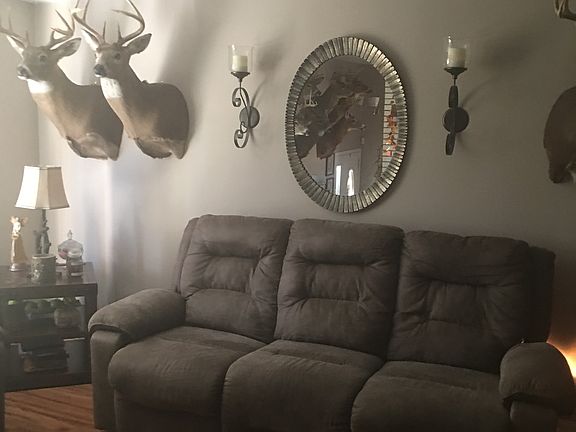 Beautiful Brick home located on very private secluded property. Home has two large bedrooms with newly remodeled bathroom. 2 car large metal detached garage. Finished family room in basement with custom made wet bar, laundry room on lower level. Working brick fireplace in living room as well as built in electric fireplace in family room. Laminated wooden flooring in living room, kitchen, dining area, and bathroom. Bedrooms have newer carpet, family room on lower level had tile flooring. Two decks on back of home. One on 3rd level off of bedroom area and larger one on lower level off of dining area. Beautiful quiet area to entertain friend with fire pit and benches. We are also offering 2 bedroom sets, dining room set, two living room sets as well as appliances with the sale of home.