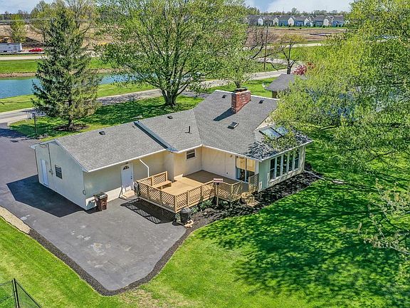 Country living, on half an acre with mature trees and view of pond. Whether you want Lewis Center and Olentangy Schhools, or want to downsize, this ranch is the perfect place! Serene setting with private back yard full of mature trees, large deck for gatherings and large shed for storage! Large living and family rooms filled with abundant light. Spacious family room with wood burning stove, wall of windows and skylight! Meticulously kept home with many nice updates throughout that include: New Roof, Family Rm windows, New kitchen appliances, renovated baths, freshly painted interior Naturestone garage flloor, driveway sealed., H2O tank. If only all homes could be this well loved and maintained! This one won't last!