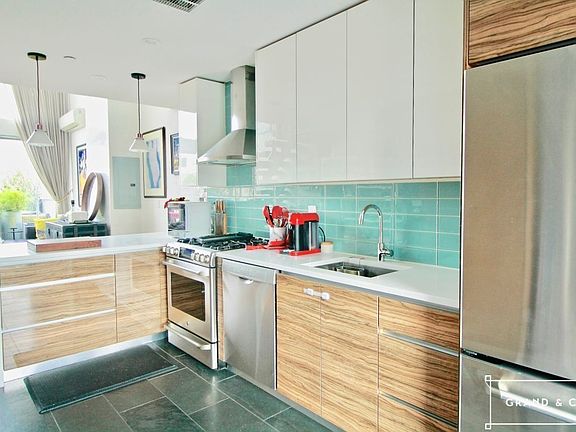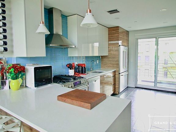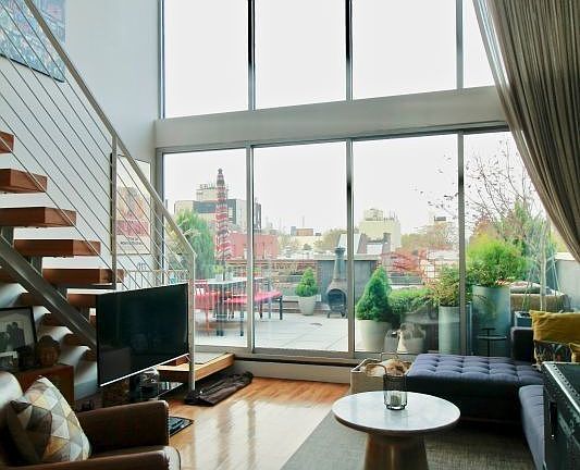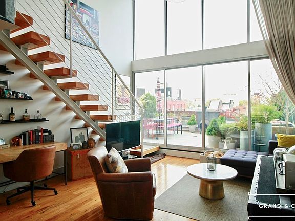 Fantastic duplex penthouse unit on Powers and Graham spread over the top two floors of a 25 ft wide condominium. Upstairs you will find a large master bedroom with ensuite bathroom and conveniently placed washer/dryer, two generous closets, and a private 150 sq. ft. terrace featuring ProMelt snow melting automatic mat upstairs on back bedroom terrace Come downstairs into your massive living space with 20 ft cathedral ceilings and floor to ceiling sliding glass doors that open out onto your own private terrace with 345 sq. ft. of space and incredible city views. Top notch high end chefs kitchen with eat up counter, large pantry and a generous dining area. Down here you will also find a large second bedroom with extra large closet space, floor to ceiling windows, and a Juliette balcony. Additional private terrace off the kitchen (yes, 3 private terraces in total, ALL with city views!). Additional beautifully finished bathroom with deep soaking tub down here as well. To top it off, this unit has its own large storage unit in the basement. Mini-split built-in A/Cs, dishwasher, in-unit laundry, and floor-to-ceiling custom remote-controled curtains, Philipps hue lights under all cabinets and stairs. Additional shared roof deck for entire building as well. Beautiful light throughout this unit, at all times of day! A dream for entertaining and inciting real estate envy amongst your friends. Fire up the BBQ and get out the sunscreen! Best of all, super super low maintenance building with only $340 per month in common charges and taxes of $57 per month, with over 19 years left on a tax abatement!!!! Steps to the Graham L, 5 min walk to the Lorimer L/G, and a hop and skip away from Bedford and the Northside. Dont miss this opportunity to own your dream home with half the monthly costs of comparable units out there!