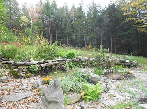 Private contemporary with many amenities. Sit on the deck, in the screened porch or in the hot tub, and listen to Watts Creek below. Stone paths and plantings. Wooded with some open area. The interior has an open floor plan with a new kitchen: stainless appliances, neutral cabinets, solid surface counters and wood floors. The 2-story living room has a stone fireplace and floor-to-ceiling windows. A saltbox-style outbuilding could become a guest house or workshop/studio. Sheds. Title V compliant.