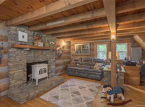 Beautiful cabin nestled in the woods with nobody around to bother you. The sun comes up over the mountains right outside your master bedroom windows. Newly refinished hardwood floors, brand new forest green tin roof, and recently resealed & chinked exterior. HVAC is only 2 years old, but also has outdoor wood stove that heats the water & air if you want to cut your power bill in half! Upstairs loft bedroom has a small nursery off the side of it that could be used as a bedroom or office. Large flat back yard, with large flower garden in the front. No restrictions or neighbors in sight.