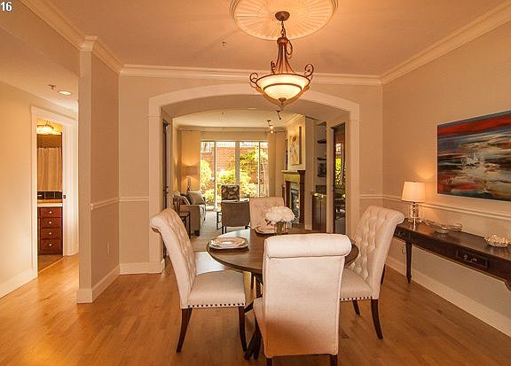 Beautiful one level condo. Great room concept with hardwood floors, crown moldings, lighted built-ins. Every attention to detail for the discriminating buyer. Kitchen with Cherry cabinets, granite counter-tops & stainless steel open to beautiful dinning room and living room with built-ins, gas fireplace and 9 Ft. ceilings. Sliders open to cute patio. Miles of walking trails just out side your door on Spring Water Trail Bike score 89.