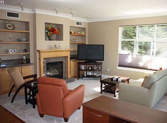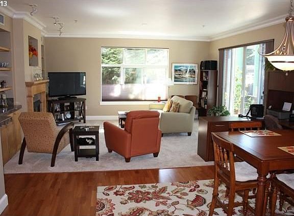 Secure Bldg 1 level living w/ Elevator. River views from balcony and within.Two deeded parking spaces,1-cov, incl. Open flr plan w/ gourmet kitchen,granite,stainless appl, hardwoods, and great outdoor entertaining space.On Springwater Trail walk to parks,shops,dining and library.