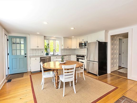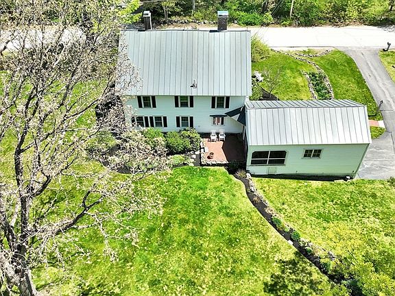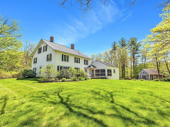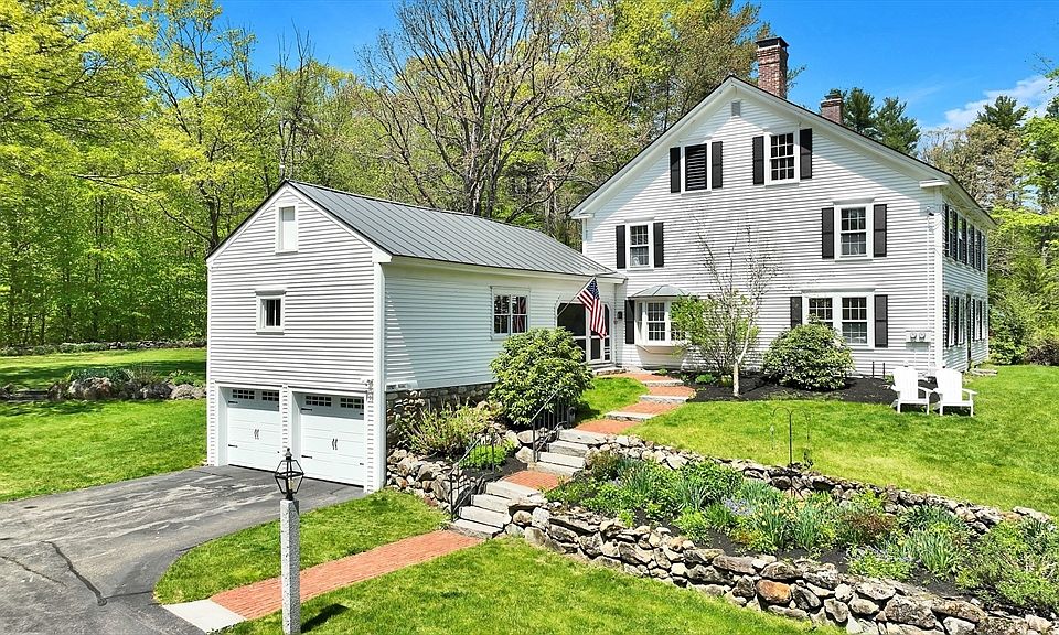 This meticulously maintained 18th-century Colonial on 8.7 acres offers 2,880 sq ft of elegance and modern conveniences. Featuring two staircases, two wood-burning fireplaces, central AC, updated electrical, and a newer standing seam roof. The bright, sunny interior has wide pine boards and an updated kitchen with Corian countertops and stainless steel appliances. The first floor includes laundry and a versatile office/bedroom/den. Upstairs are four large bedrooms, with a walk-up attic for extra storage. The screened-in 3-season porch, attached two-car garage, workshop, and detached barn provide ample storage. Walking distance to the village and highly rated Hopkinton schools. Expansive grounds perfect for events.