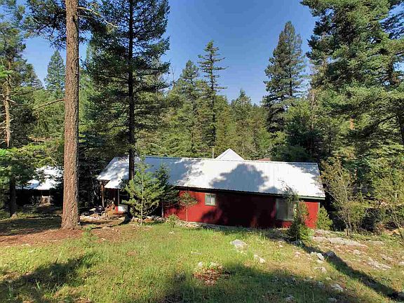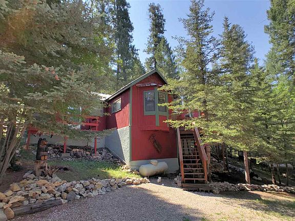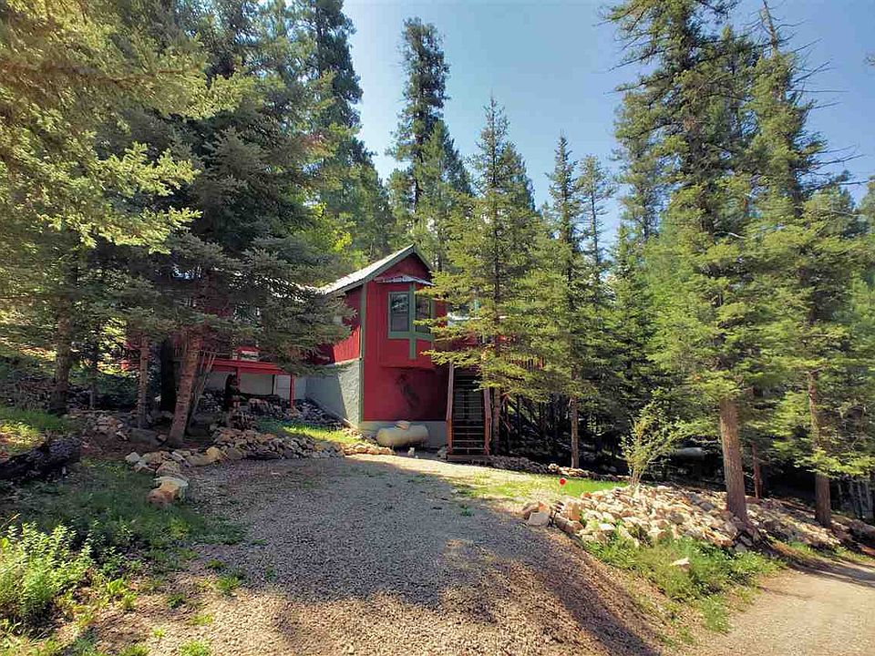 Live the mountain life in the tree tops in this charming village cabin with 3 bedrooms, 2 baths, all on one level. Wood burning stove has tile surround, dining nook is surrounded on 3 sides by windows, front door opens to deck, back door to grilling porch. Master has bath en-suite, bedroom #3 is also laundry room. Storage underneath. Circle drive provides off street parking. Top of the lot touches Ntl Forest, hike off property. Being sold "AS IS", no repairs will be made, inspection report available.