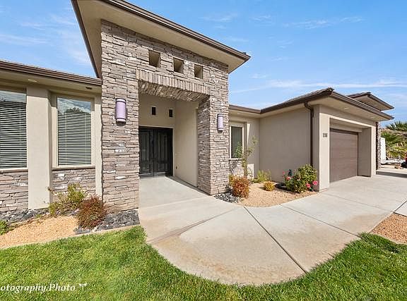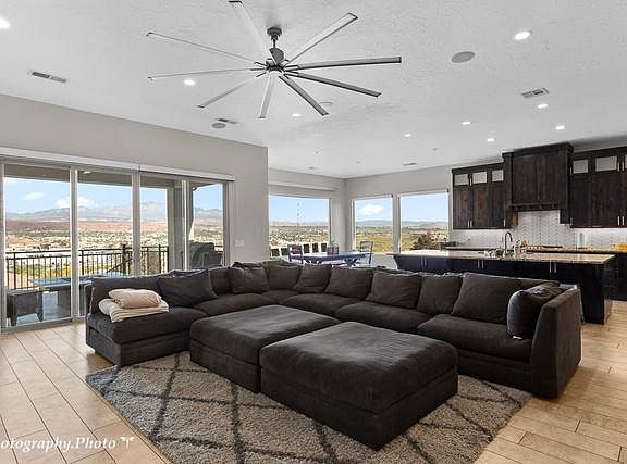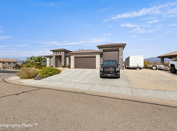 Best views in St. George! Unbelievable sweeping prime view of the city of St. George, Pine Valley Mountain, Zions, Kolob, Red Mountain..Enjoy the experience around your heated pool and hot tub in your own back yard paradise, or from the large covered deck around the fire-pit. Plenty of parking with an RV Garage (35' Deep) or park 4 cars in the garage and still have room to park an RV at the side of the home! Impressive upscale home with deluxe kitchen and including large island, Custom Staggard Cabinets, top of the line appliances, glass mosaic back splash, granite counters, plank tiling throughout. Heated floor in Master Bath, laundry in master suite, plumbed for steam shower..Walk out basement also with views, large rec room with full kitchen and laundry. Prime location with proximity to all services and golf course!