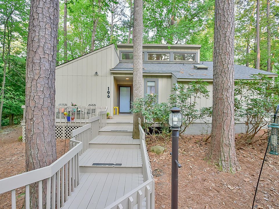 Great lot, great house, and great price on the best street in Fearrington's Historic District. Large, private .74 acre lot on cul-de-sac offers peace and serenity. Single story, open floor plan provides comfortable, convenient living. Three bedrooms, two baths, and a fireplace make the home warm and cozy with enough space for family and friends. Huge main bedroom and walk-in closets in every bedroom. Built-in bookshelves in living room. Tall ceilings with clerestory windows, skylights, and four-season sunroom provide natural light on beautifully wooded lot. Large deck for grilling, dinners, or just kicking back. Outdoor storage space large enough to be a small workshop. Walking distance to the pool/tennis club and shops and restaurants of Fearrington Village. New roof in 2023. Well maintained house on a well kept lot.