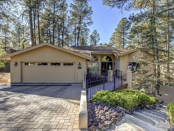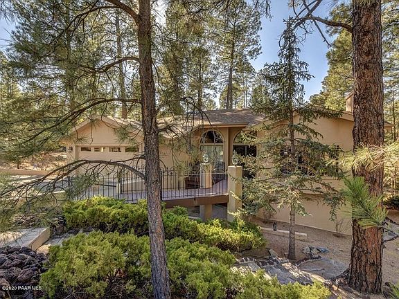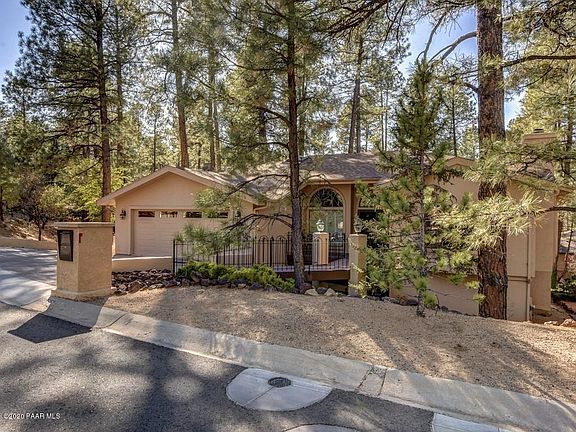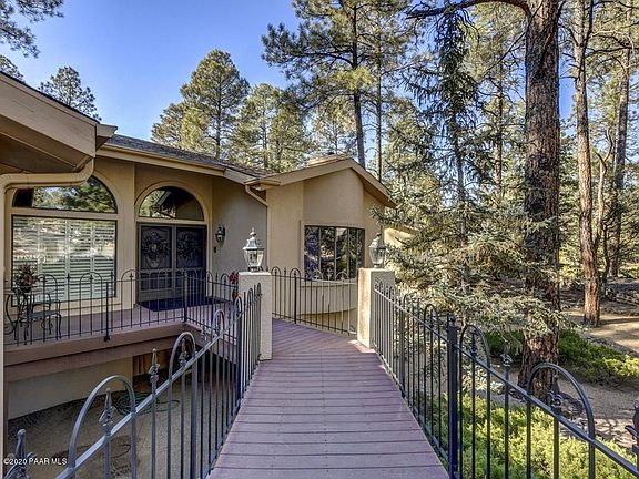 Located in the highly desirable Community of Hidden Valley Ranch, which borders the Prescott National Forest and just minutes from downtown Prescott, this Custom Home touts elegant and unique architecture including cathedral and coffered ceilings, arched room entries, dentil crown molding and wainscoting throughout the main floor.The main level living area is approximately 2,600 square feet of warmth and comfort. Custom kitchen, formal dining room, cozy and elegant formal living room with fireplace, Master Suite, guest bedroom and bath, Great Room, laundry room and lovely Arizona Room, make up this well designed Live On One Level home.The lower level walkout basement offers a guest bedroom and bath, a potential exercise/hobby/guest bedroom, den, media room, craft room and 4 walk in