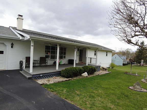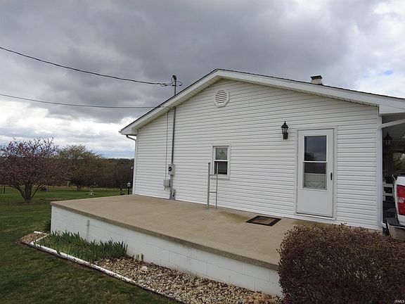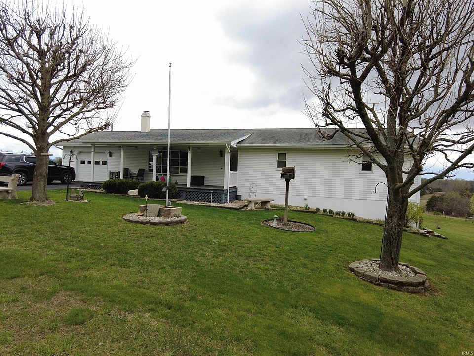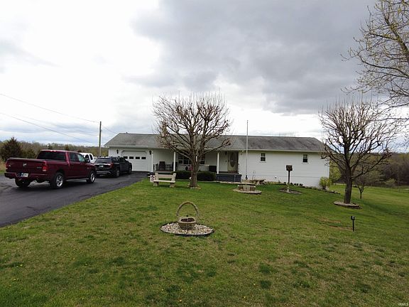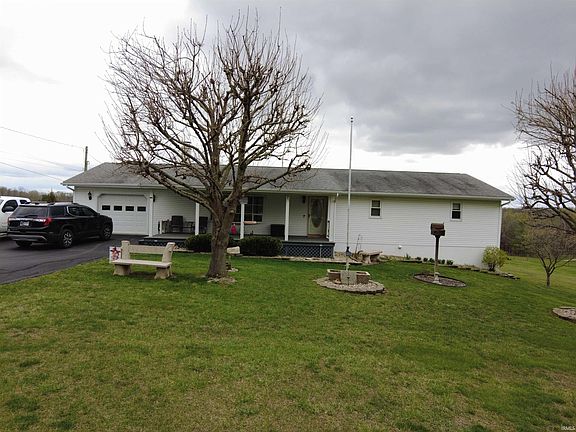 Experience living in the landscape of southern Indiana with this beautiful home situated on almost three acres. The homeowners had a well-known contractor build this well maintained and immaculate home 45 years ago. The family room is spacious with a brick wood burning fireplace and an exit to the eat-in kitchen with walnut cabinets and countertops. The kitchen is complete with a a large stainless-steel refrigerator, electric stove, dishwasher, and disposal. The three bedrooms and two full bathrooms are on the main floor with the washer and electric dryer in the downstairs area. The home has three attached outdoor areas including a front covered porch where you can enjoy your morning coffee and welcome your family and friends. Take in the morning sunrise and evening sunset while viewing the storage barns among the green pasture, leafing trees, and the fenced acreage. A paved driveway leads to the one car garage.