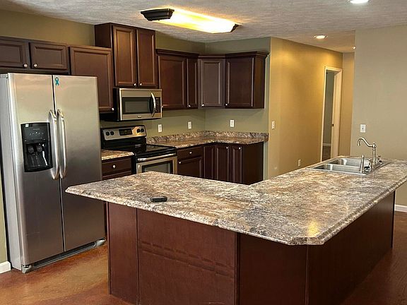 Large eat-on barStainless appliancesBrick homeScored flooring