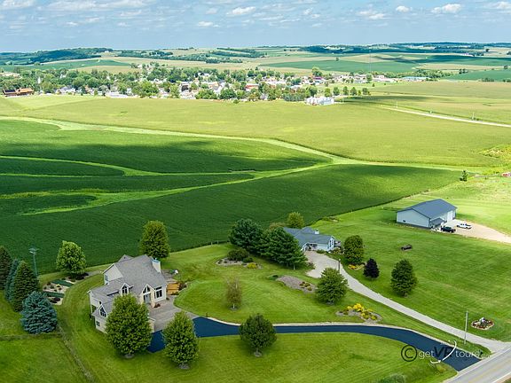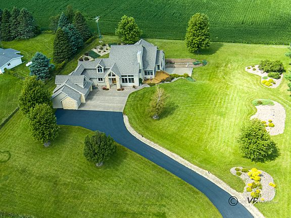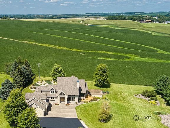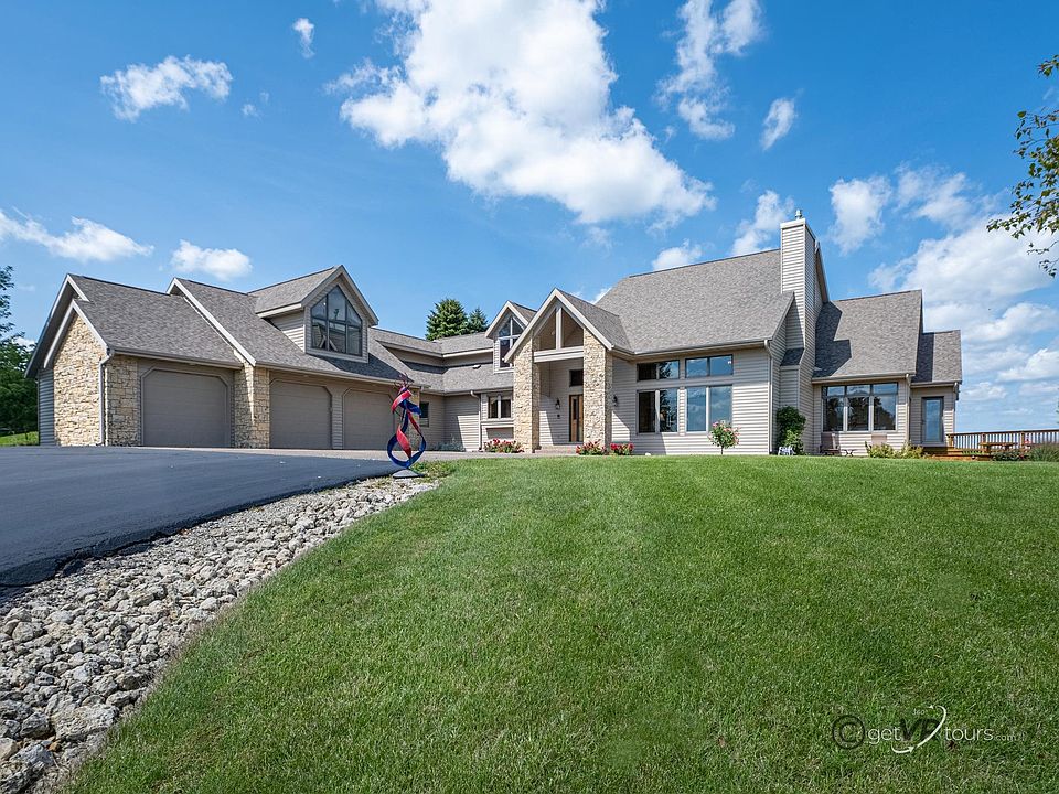 Views, views and more views! Enjoy stunning panoramas and breathtaking vistas that span for miles from this meticulously kept contemporary masterpiece with dramatic architecture custom built by Galena Hillside Homes and perfectly placed on an elevated perch surrounded by 2 acres of park-like grounds that overlook the gorgeous rolling terrain and treed ridges of the Jo Daviess countryside. Spectacular curb appeal is evident with clean lines and stone accents, including stone pillared two story entry that greets you upon approach. Prepare to be wowed from moment you enter the grand foyer that opens to sprawling main level featuring great room style living area with soaring ceilings, generous living room with towering floor to ceiling stone surround fireplace and high efficiency fire box with ceramic glass, custom oak bar wet bar built by Gary David with coffered panel accents and walnut touches, and lots of windows that frame in the extraordinary distant views and flood the space with natural light. Just beyond find a cozy sunroom that extends off living room with glass surrounding and upper transoms that directly feeds to expansive tiered deck with integrated seating and ample area to enjoy the outdoors and stunning scenery. Open dining area offers plenty of room to entertain and has ornate tray ceiling above and flows directly into modern kitchen that is a cook's haven and offers granite counters with prep space galore, eat-at high top breakfast bar, center island, gas range, wall oven, black stainless refrigerator, walk-in pantry, loads of beautiful cabinetry and a convenient powder room in the adjacent hallway. A separate office space with glass double doors is a wonderful retreat that still remains connected to the main living area and provides a bright venue for work from home activity. The spacious main floor master suite beckons when rest or relaxation are necessary, and is highlighted by more high ceilings, walk-in closet space, and luxurious master bath with spa-like whirlpool tub, heated floors, two separate vanities, integrated sitting station, huge tile surround shower, and private water closet. Custom oak staircase with amazing detail leads to upper level that houses stunning breezeway style loft with sitting area that overlooks the main level great room, two comfortable guest bedrooms each with a walk-in closet and connected by a nicely appointed full bath, additional reading nook/family area with built-in bookcases, additional powder room, and access to huge recreation room above garage with separate radiant heat and wall unit cooling. Sweeping unfinished lower level is great place for storage or future expansion and contains an extra 2000+ square feet with a portion that has radiant in floor heat and walk-out access to concrete patio/basketball court. Two rear porches offer extra vantage points from which to enjoy the outdoors and views. Attached 3 car garage has substantial space for vehicles, storage, toys, and work area, and asphalt drive allows for plenty of additional parking. Beautiful landscaping and manicured grounds complete the picture-perfect setting. Additional features include: 2 x 6 construction, Kal Kote walls, custom made oak trim, six panel doors, 2 high efficiency furnaces, zoned heating and a/c, 3 water heaters, central vac system, "Low E" windows, whole house intercom and some built-in surround sound speakers, Kohler fixtures, and steel siding. Attention to detail is more than evident throughout, and this is truly a "must see to appreciate" property. Ideal location is convenient to Apple Canyon Lake and The Galena Territory, right outside of Scales Mound and is just minutes from all the fine dining, shopping and events of Galena. Finished and unfinished square footage is approximate and sourced directly from architect (Straka Johnson).