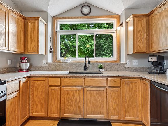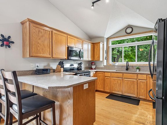Welcome to this beautiful rambler which features an open floor plan. Kitchen with durable quartz countertops. Vaulted ceilings and gas fireplace in living room. Primary bedroom with walk in closet. Large windows throughout the home provide an abundance of natural light, creating a bright and welcoming atmosphere. Enjoy a private backyard with views of the wetlands. The house is designed with entertaining in mind, as it offers a patio in the back and a freshly stained deck. These outdoor spaces provide ample room for hosting gatherings, barbecues, or simply enjoying the outdoors in a serene setting. Spacious 3 car insulated/heated garage with extra storage in attic.. Long extended driveway with extra parking pad on side of the garage. Plenty of storage with a designated storage room in the basement. Close to Shopping, restaurants, schools, parks, trails, highway 169 and more.