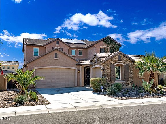 This stunning property has a plethora of desirable features and stylish upgrades that will make you fall in love at first sight. This beautiful 4 bedroom 2.5 bath two story home has so much to offer. From tile floors, open spacious kitchen, lots of kitchen cabinets, kitchen island, quartz counter tops, and stainless steel appliances. You'll love this master bedroom located downstairs, which includes a spacious walk-in closet, separate his and hers vanities. Large loft for family fun. And a 3 car detached garage. Leased Solar panels