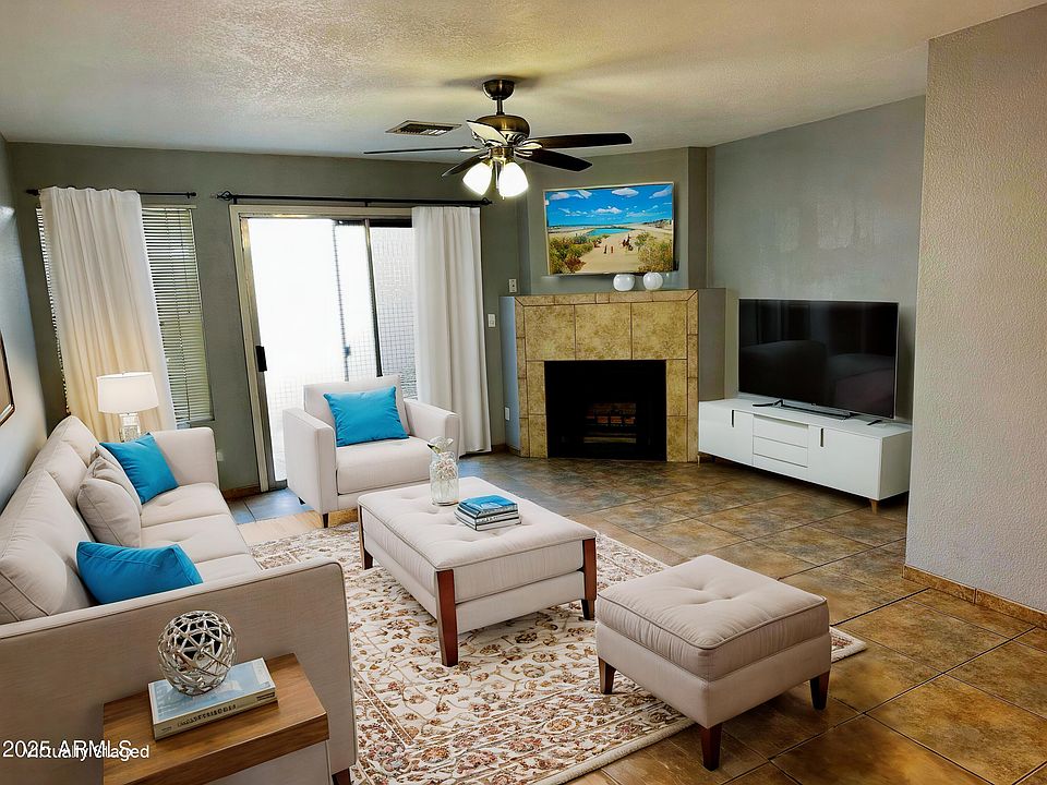"Step inside to find beautiful 15-inch tile flooring that adds both elegance and durability. Imagine cozy evenings by your very own wood-burning fireplace, or enjoying a breeze with the ceiling fan while natural light pours in through the sliding glass door."
