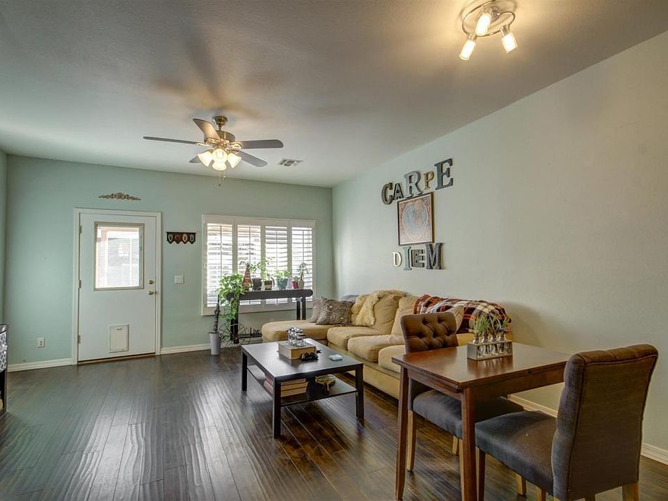Amazing opportunity to own this beautiful, upgraded townhouse. The warm, hand-scraped, wood floors welcome you to spacious home filled with natural light. The floor plan is perfect with an open concept large living room, spacious kitchen with built-in microwave, glass-topped stove & pantry. One bedroom and the powder room are on the first floor with TWO master bedrooms both with complete master baths upstairs on opposite ends of the home. An added bonus is that the inside laundry is also located upstairs, Move in ready with new ceiling fans, toilets & designer paint. There is a lovely enclosed patio just steps away from your covered parking. This well maintained community offers lush landscaping, a newly remodeled community pool & repaved streets. Centrally located and close to school