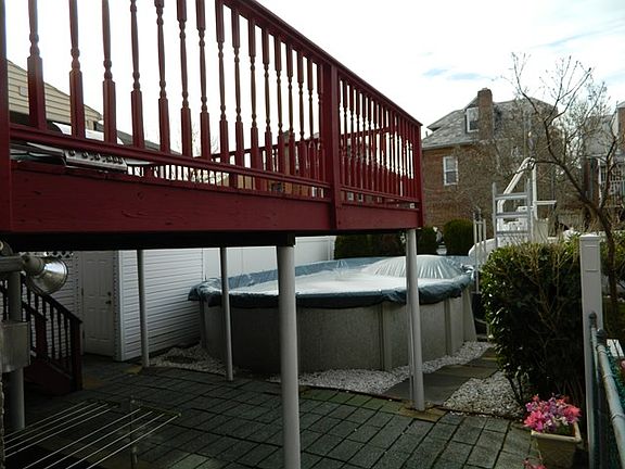 Morris Park location , brick detached Colonial home, 3 bed 2 bath, new Anderson Bay window and sliding door from formal dining room to large rear trex deck , living room, eat in kitchen, recessed lighting , granite counter tops, marble tile back splash with glass tile trim, new Italian ceramic tile floor, crown molding , second level has large master bedroom, large bath completely tiled, stand up shower and separate tub, marble sink , hardwood floors throughout, finished basement , family room, full bath , laundry , storage has walk out access to patio and pool, new gas steam boiler and hot water heater , close to public transportation, school and retail stores.