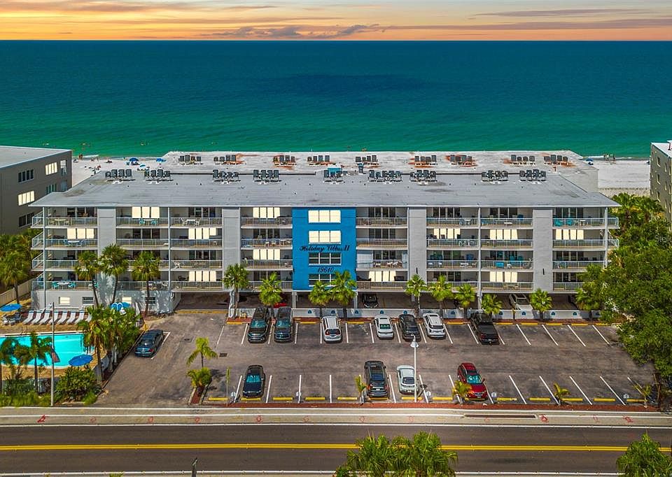 Beachfront Bliss at Holiday Villas II Live the Gulf Coast dream at 19610 Gulf Boulevard #101, a first-floor, corner condo with direct beach access, wraparound balcony, and breathtaking Gulf views. This 1,100 sq ft, 2-bedroom, 2-bath retreat offers a bright open layout, tile flooring throughout, and a kitchen flowing into the living and dining areas—perfect for entertaining or sunset watching. The primary suite includes an en suite bath, while the guest bedroom and second full bath welcome family and friends. Corner-unit perks mean extra windows, added privacy, and abundant natural light. This fully furnished unit is ready to be your primary home or a rental source of income—your choice. Short-term rentals are allowed with a 4-day minimum. Holiday Villas II provides a heated beachfront pool, outdoor grill, covered parking, and elevator access, with monthly fees covering water, sewer, trash, cable, exterior maintenance, pest control, and pool care. Enjoy the rare mix of lifestyle and opportunity—where every day ends with a postcard-perfect sunset.