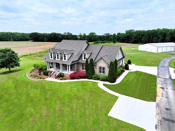 Lovely 4/5 bedroom home w/4573 total sq ft and setting on 10.81 acres with a 7200 sq. ft. nice detached bldg. Completely finished walk-out basement w/living/media room, bedroom and a 3/4 bath. There is a 29x18 bonus room w/ built-ins that could serve as a second master. New paint throughout, new roof, new central unit, and all hardwood floors re-varnished. There are 3/4 bedrooms on the main level and 1 in the basement. Hardwood flooring throughout except tile in the wet areas. The house has approximately 4573 sq. feet of living space and there is 2300 sq. ft. of attic storage area which is accessed by a permanent staircase. Beautiful setting w/nice landscaping. 24x48 tractor shed also on the property. More details under "Documents".