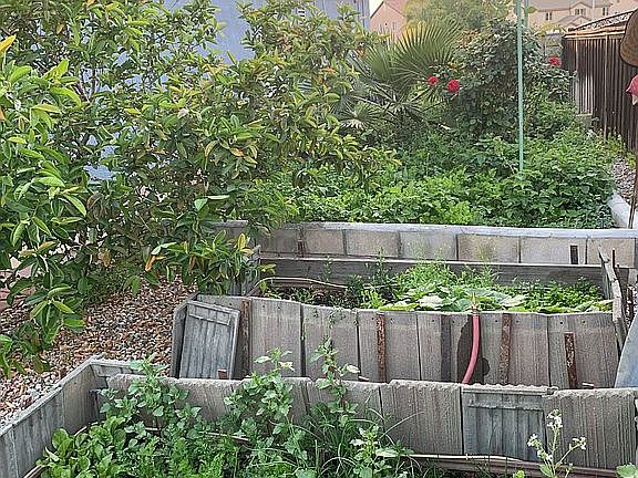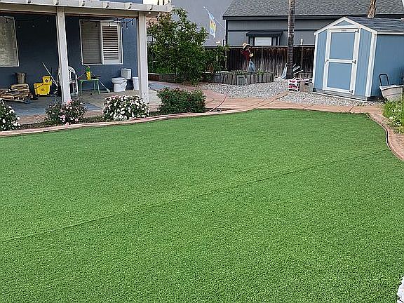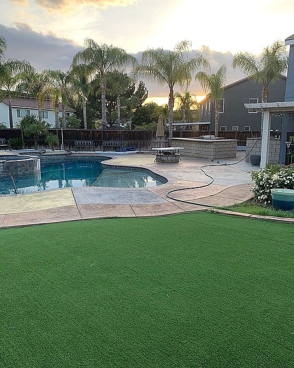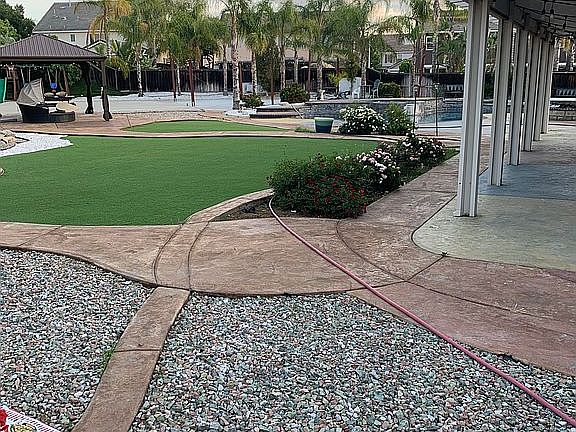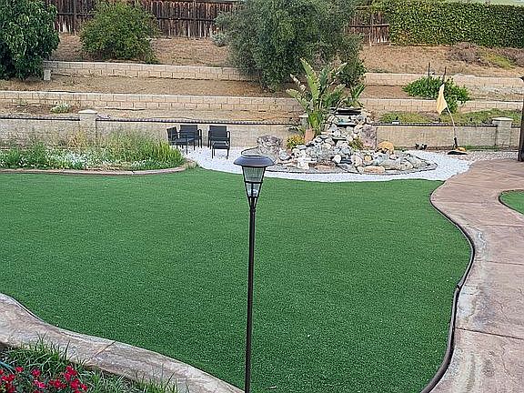 Big back yard .29 acres. Waterfall, fake grass, color rocks, concrete design. 2 Walls long 170 Ft. on the slop, lots of trees. Built in BBQ.