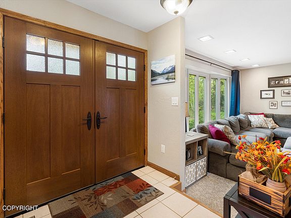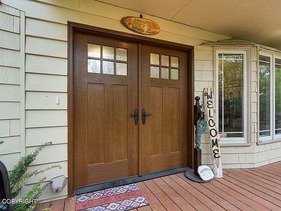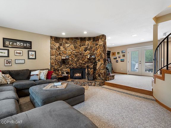 Cozy Alaskan home on 2.65 level useable acres surrounded by mountains. The long driveway allows for plenty of parking and privacy. Central location with a short commute to Anchorage (20 minutes to JBER) or the valley (20 minutes to Mat-Su Regional). Open floor plan & large areas on the lower level for gym/game room. All bedrooms are on the same level upstairs. Master bath has vanity & huge shower.Horse stables with power in each stall. Seller planned to use it as a wood working shop. Mature trees including apple trees. Back up generator that comes on automatically installed fall of 2022. Triple pane windows in living room. New french door w/built-in shades. New front door for added security/locking mechanisms. Garage roof replaced - 2021 Outlets in garage upgraded so theres plenty of power outlets for all your freezers, tools, etc.