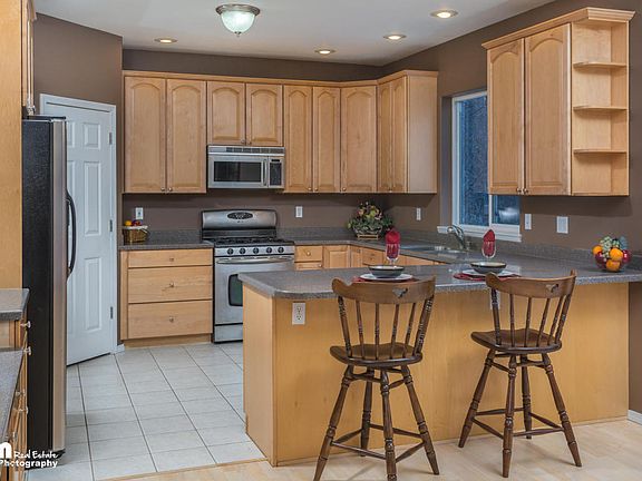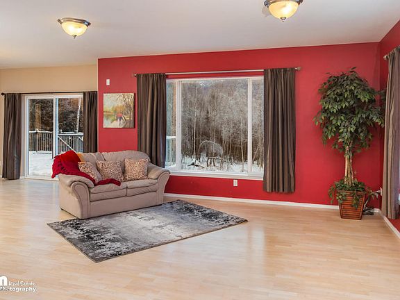 Stunning Chugiak Home on Secluded Lot at end of Cul-De-Sac! Open Kitchen/Dining/Living Concept w/Gas Stove. Kitchen Features Maple Cabs/Solid Surface Counters, SS Appliances, Large Pantry. Trex Deck off Kitchen w/ Mountain Views! In-Floor Heat. Mstr w/Private Ensuite. 5 Beds up w/Laundry Rm. Full Walk/Out Bsmt w/Bonus Room. MIL Potential.Lots of Storage. Home backs to 220 Wooded Acres. Large Gge!