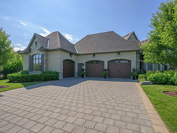 Set within the prestigious enclave of Bournewood Estates, this 2/3-acre property offers privacy and serenity, backing onto lush green space and a tranquil pond. A classic stone-and-brick façade is set back on an emerald lawn framed by perennial gardens and evergreens, creating a lasting impression. Inside, approx. 4,000 sq. ft. above grade plus 1,200 sq. ft. finished below blends generous proportions with thoughtful design. Step into Impressive foyer light fixture crowning the Walnut hardwood, California shutters, and sunlit principal rooms highlight sweeping views of the deep, treed yard. The living room is anchored by a ceiling-height stone fireplace, custom antiqued-mirror curio cabinetry, and coffered ceilings, opening seamlessly to a large kitchen with extensive ceiling-height cabinetry, leathered granite island w/designer lighting, walk-in pantry, and a rotunda-style breakfast room encircled by windows. A private study with cathedral ceiling & wall-to-wall library built-ins, elegant dining room with showcase chandelier and adjacent butler's servery, chic powder room, and mudroom with extended bench seating complete the main floor. Upstairs, four bedrooms each enjoy ensuite access. Double doors lead to the primary suite with walk-in closet and luxe 5-piece ensuite featuring spa tub, dual sinks, and oversized glass shower with bench. A princess suite offers its own 4-piece, while two additional bedrooms share a 5-piece with separate wet-room. Convenient second-floor laundry with upscale cabinetry. The finished lower level provides a large sunlit rec room, full bath, and space for a fifth bedroom. Outdoors, a full-width deck overlooks a sprawling fenced yard with room for a pool and play space, framed by White Pines and cedars for year-round privacy. Oversized 3-car garage. Close to Firerock and The Oaks golf courses, West 5 amenities & restaurants. An estate of timeless architecture and modern luxury in one of London's most exclusive communities.