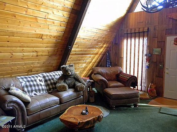 You won't feel confined in this 1500 sf, 2BR open & airy A-frame w/glowing T&G interior. Soaring beamed ceiling and a toasty warm wood stove w/built in wood box. Huge loft sleeps many plus room for office or game area. Large utility room w/storage galore. Metal roof & rear Trex deck for BBQ's. 2 storage sheds, fire pit, circular drive and stately Ponderosa pines and new aspens create the ideal mountain retreat from the city. A lot of home to love.
