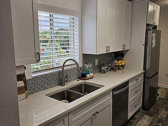 Waterfront VIEW! You can't beat this location and views of Curry Creek! This 2 BEDROOM, 2 BATH END UNIT features a SPLIT FLOOR PLAN and is the LARGEST UNIT in the complex. Vinyl plank flooring throughout, new stainless steel kitchen appliances, new washer/dryer and kitchen newly remodeled with Quartz countertops. Plantation shutters in both bedrooms. Unit features 3 FRENCH DOORS leading out to the large Florida Room from the Kitchen, Living room and the Master bedroom with beautiful views of Curry Creek. The Guest Bedroom has its own lanai where you can view relax and enjoy the view as well. WASHER AND DRYER are in the unit in a large utility room with lots of room for storage. This Condo also has 2 PARKING SPOTS assigned to this unit. There are Kayak racks, a dock where you can fish, a pool and shuffle board available. If you are looking for a peaceful, relaxing place this is it! Call today.