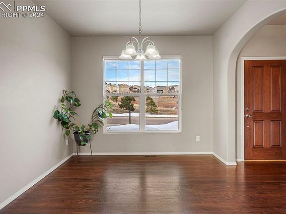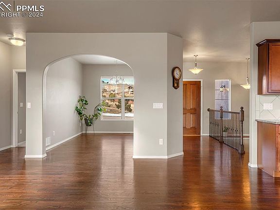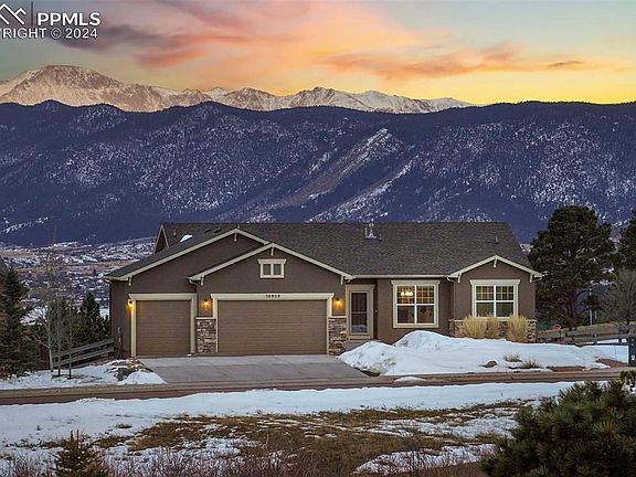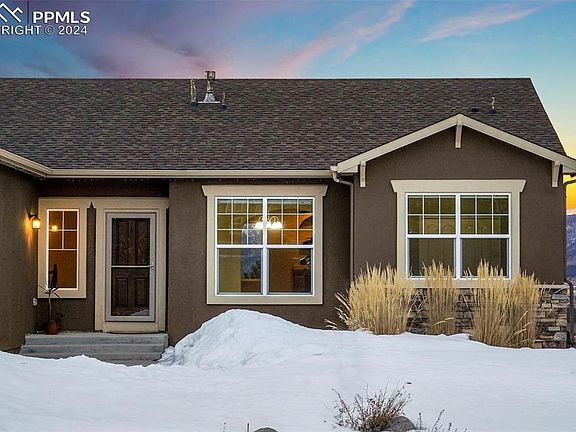 This gorgeous ranch home has one of the best lots in all of Misty Acres! It has amazing mountain views with large windows both on the main level and basement that allow you to see the entire Pikes Peak range from Monument Hill to Norad. It sits on a hill with a slightly sloping lot so your views are unobstructed. You enter the home to a large open space with 9 ft ceilings, hardwood floors, and tons of natural light from the large windows. The main level living room features a stone surround gas fireplace, dining room with beautiful arches, 2 bedrooms, 2 full baths, laundry room, and an open concept to the kitchen. The chef's kitchen features granite countertops, gas counter stove, double ovens, all stainless steel appliances, and lower cabinets have pull out shelves for easy access. The primary suite has a large picture window, again giving you an unobstructed view of the mountains, hardwood floors, and opens to your primary bathroom with separate water closet, double vanity, and large cedar lined walk in closet. The primary bathroom shower is a large walk in, no door or curtain needed, complete tile surround, with 2 shower heads, and a bench seat. Your laundry/mud room is right off the 3 car garage and already has Elfa shelving and comes with front loading washer and dryer. The basement garden level has just as many features as the main level. Huge windows with tons of natural light and mountain views. There is a guest 1/2 bath, flex room with barn doors that an be anything you want it to be from office, gym, theatre, etc... The main basement family room features prewired surround sound and a wet bar with wine fridge, mini fridge and a second mini fridge that can be set up as a dual kegerator. There are an additional 2 large bedrooms, 1 with walk in closet, another full bath, and lots of closets for storage. The neighborhood features open spaces, hiking/walking trails that, close to schools, shopping, dining, I25 and Air Force Academy and much more.