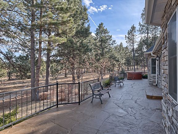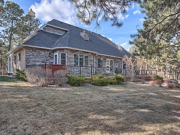 Southern Charm in Wissler Ranch. Located on 3.48 acres of amazing Ponderosa Pine, this extremely private location backs ranch land. Amazing details with wainscotting, crown molding, white pillars, architectual niches. Custom work throughout, outdoor living space, + additional, two car, heated garage/shop + oversized three car, attached garage. Real cook's kitchen w/exquisite cabinetry. Five bedrooms, five baths, main master & dedicated office. Junior suite upstairs w/own living area. Hardwood and granite. Immaculate Enter into the winding, paved drive to an elegant home. All professionally landscaped with rock tiers and plantings. Beautiful, covered wrap front deck perfect for warm evenings.. The entry opens up to a high vaulted living room with stone gas fireplace and wall of windows overlooking the towering pines and flagstone decking and fire pit for the perfect out door living space. Hardwood throughout main & upper levels. 42 inch cherry cabinetry in the private kitchen with eat in nook. Walk in pantry and large laundry room w sink open to a finished, oversized three car garage for big trucks. The office opens up to the entry on the opposite side with the main level bedroom walk out to decking and is complete w/ beautiful five-piece bath. Upstairs are three bedrooms and two baths, one with jr suite and den. The garden level basement has a media/theatre room set up, exercise space, and 5th bedroom and bath. Lots of storage space available. Don't forget about the heated, 35 wide by 25 deep, detached garage. Something for everyone here. Great location with easy commute to Springs, Monument, or Denver. All paved roads, hot water heat, attention to detail. Joy to see