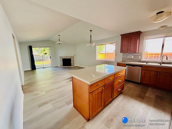 one-level home in excellent condition, New flooring, carpet and fresh interior paint throughout! Four bedrooms and two baths, family room and separate living room, the kitchen has an island with quartz countertops and stainless steel appliances. In unit washer and dryer. Relax in the beautiful backyard with sprinkler system. 2 car garage, plus 2 parking spaces on driveway. ** Front and back yard currently undergoing reseeding so not as shown in picture** Small pets allowed with homeowner approval, additional $500 deposit and $100 additional per month pet rent per dog, $50 per cat.