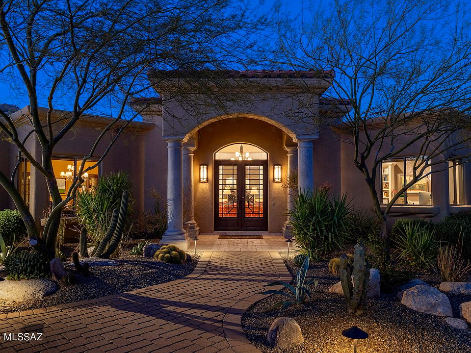 Nestled within the exclusive guard gated community of Pima Canyon, this thoughtfully designed residence embodies a timeless aesthetic, blending classic architectural details juxtaposed against the rugged beauty of the Sonoran Desert. The approach to the home unfolds as a carefully composed sequence, where the curated landscapes provide a textured backdrop to the residence's stucco clad facade and gracefully arched entryways. The interplay between structure and setting establishes a welcoming presence, creating a seamless transition between built form and natural environments. Stepping through the striking custom glass and iron entry, the interiors extend an invitation, spaces conceived not as mere enclosures but as experiences shaped by light, material, and craftsmanship. The living room, an expansive yet intimate volume, embraces the outdoors, framing the ever-changing drama of the Catalina Mountains through carefully positioned openings. Natural light is allowed to filter gently, shifting throughout the day and lending the space a dynamic quality. The materiality of the interior is rich yet restrained, warm yet enduring. Italian Travertine flooring, handcrafted woodwork, textured walls, each element is imbued with a tactile honesty that speaks to craftsmanship and permanence. Wrought-iron and copper detailing punctuate the composition, offering moments of contrast and articulation, reinforcing the human touch within the greater whole. The kitchen is designed with both beauty and function in mind, offering a refined yet approachable aesthetic that caters to both casual dining and formal entertaining. Custom Cherry wood cabinetry is complemented by hand-selected granite countertops, which provide a rich visual contrast. Design and utility converge in a space that is as visually stunning as it is effortlessly functional. A paneled Sub-Zero refrigerator, sheathed in warm wood to mirror the surrounding bespoke cabinetry, creates a seamless façade that speaks to the home's refined aesthetic. Just steps away, a spacious walk-in pantry offers discreet yet generous storage, while a central island, topped in honed granite, serves as an anchor for meal preparation. Wrapping around the perimeter, an expansive secondary island with raised bar seating invites informal gatherings, offering a vantage point into the adjoining family room and reinforcing the kitchen's role as the heart of the home. At its culinary core, a professional-grade Viking cooktop is framed by a custom-designed hood, acting as a centerpiece enhanced by artisan-crafted tile work along the backsplash, an intricate, textural detail that elevates the room's cohesive, curated elegance. Adjacent to the kitchen, an intimate breakfast nook is bathed in morning light, offering a quiet retreat with views of the garden, while the formal dining room, with its statement lighting and classic wainscoting, provides a more structured setting for entertaining. The residence's thoughtfully designed floor plan balances openness with privacy, creating distinct yet connected spaces. The owner's suite, privately positioned in the northeast wing, is a true retreat, offering a graciously proportioned bedroom with coffered ceilings, a fireplace for added warmth, and French doors that open onto a dedicated terrace. The adjoining bathroom features a freestanding soaking tub, a custom vanity with marble countertops, and a glass walk-in shower framed by hand-laid tile. Across the home, the secondary suites mirror the same attention to detail, with their own well-appointed bathroom and garden views that enhance the sense of retreat. Beyond the interiors, a collection of outdoor living spaces extends the experience of the home, carefully positioned to maximize views while offering a variety of settings for relaxation and gathering. The rear veranda, shaded by deep overhangs, opens onto a series of tiered patios framing the pool, spa and outdoor barbecue. The arrangement is purposeful, positioning each element in relation to view, light, and movement. Native plantings and mature trees provide dappled shade, while meandering flagstone pathways connect the terraces, enhancing the sense of intimacy within the larger landscape. Situated just minutes from La Encantada's premier shopping and dining, as well as La Paloma Country Club's renowned Jack Nicklaus-designed golf course, this residence offers a refined and comfortable lifestyle. Its seamless blend of traditional architectural elements, thoughtfully curated interiors, and connection to the surrounding desert landscape make it a home of enduring beauty and grace.
