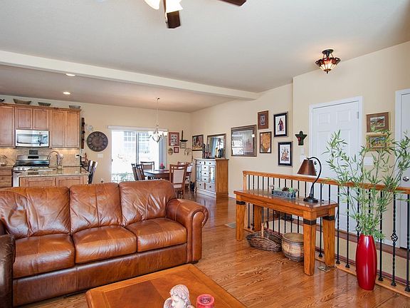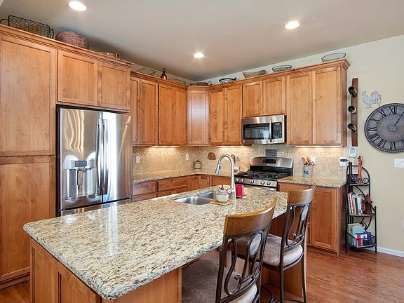 Gorgeous former model home w/ all the upgrades! Stunning kitchen with eat-at island, stainless appliances, gas range, slab granite, & under cabinet lights. Wood floors & wrought iron rail. Main level Master Ste w/ large shower, high counter w/ double sinks, & walk-in closet. Main level laundry. Finished lower level with large rec room, 2 bedrooms, full bath, & storage. Low maintenance backyard w/ big patio, artificial turf, & drip system to all shrubs. Finished garage w/ shelving. Snow and Trash removal.