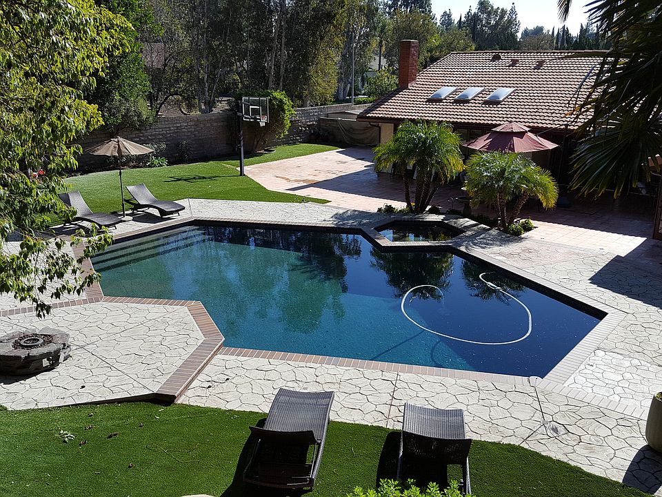 Located on a huge corner lot in a beautiful neighborhood of Chatsworth on a quiet cul-de-sac street. Circular driveway leads up to 3 car attached garage & R.V. access. Beautiful park like grounds w/pebble tec pool & spa, stamped concrete, drought resistance turf & brick around decking. Paver tile around decking in rear along with a basketball court & Side storage area w/shed. Beautiful mature landscaping w/tremendous trees for privacy. Gourmet kitchen w/gorgeous wood cabinets plus a decorative tiled island. Fabulous set-up w/4 bedrooms on 1 side of the home & a teen or in law set-up on the other. Family room w/high ceilings & skylights w/views of the rear entertainer's yard. Huge formal dine w/french doors & skylights. Master retreat w/huge master bathroom. Travertine floors & counters plus a separate slate steam shower & stand-alone tub. Huge walk in closet & custom built in dresser. Beautiful hardwood floors around home. Very Secluded & Private home. Seller purchased Solar System so huge savings on Electricity.