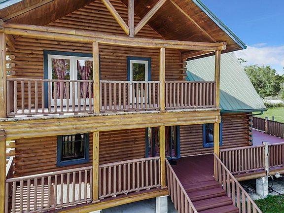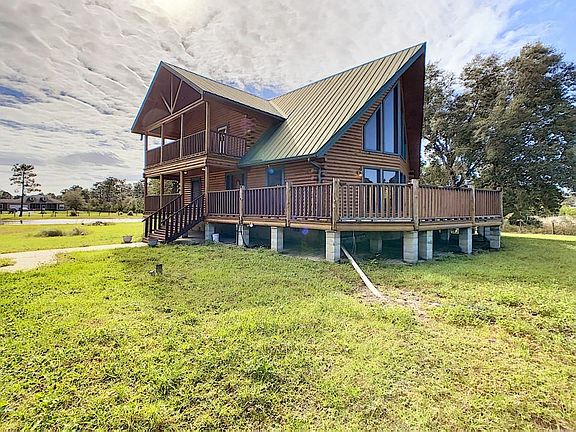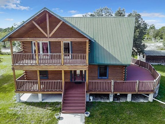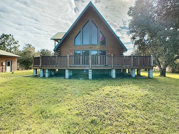 This beautiful one of a kind log home is a must see! Experience the mountain living feel right in the heart of Central Florida. Located in the cozy community of Wedgefield, you have the benefit of space and privacy, with only a short drive to Orlando International Airport and local attractions. The neighborhood boasts the Wedgefield K-8 school, golf course, country club and restaurant, community park, and 10,000 acre nature preserve perfect for hiking, camping, and horseback riding. This home is situated on 2.6 cleared and level acres, complete with a fenced rear yard and stocked pond. Bordered by forest with designated wetlands to the east, a farm to the north, and an easement to the west, you will have privacy as the Wedgefield neighborhood expands and builds. A detached 2 car garage is perfect for a workshop with electrical outlets and pegboard lined walls. A 2 stall horse barn with water and power, just needs some roof repair. You will feel like you are on vacation in this spacious open concept floor plan that features 3 bedrooms, 2 full baths, an airy loft, second story balcony, and floor to ceiling windows. Vaulted wood ceilings, a split log staircase, cypress tree columns, and granite countertops are just a few of this home's unique luxury features