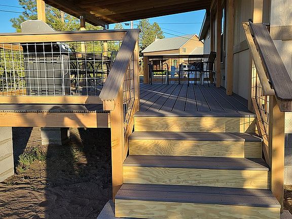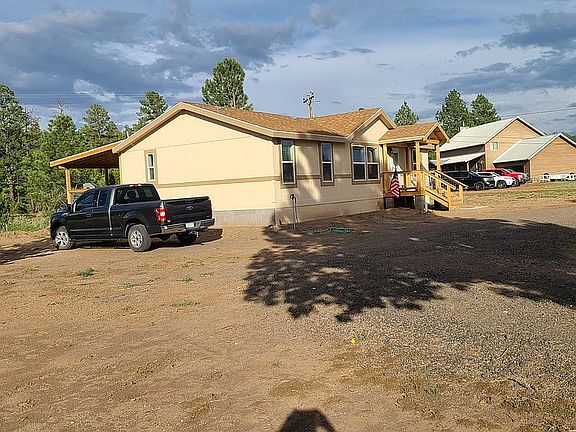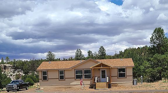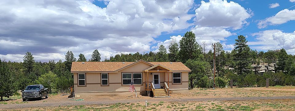 This is Horse Property with a brand new 6 stall metal horse barn, 12x12 feed and tack shed and a 12x12 tool shed. It is half fenced for turnout and has a round-pen. The previous 2 br2 bath summer home has been pulled out and has been replaced with a brand new Cavco Durango 3br 2 bath double wide. The manufactured home was delivered and set in Oct 2021. I have added a 6x10 covered front porch and a 12 x 21 covered back deck. The property backs up to Buckskin Canyon wash and has a beautiful view from the back deck of the wash and pine trees along it.