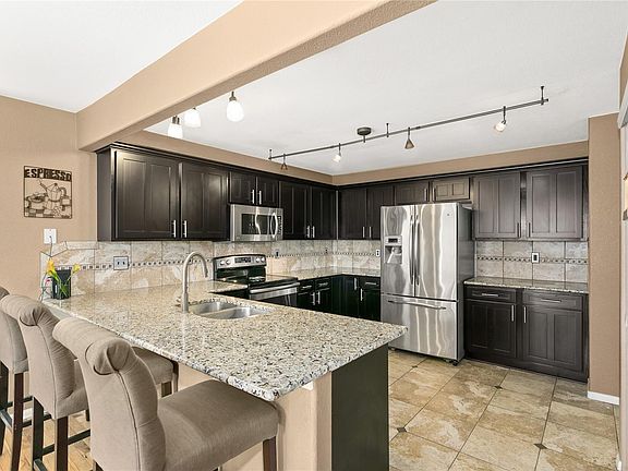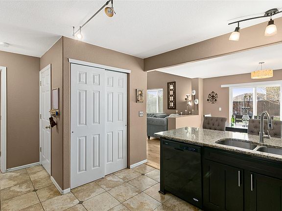 Gorgeous updated two story in Sterling Hills. Gleaming wood floors, 20ft ceilings, newer paint. Kitchen remodel has new cabinets, granite counters, stainless appliances, new faucets and fixtures, large format travertine tile floor. Master bath remodel and walk-in closet too. Newer carpet upstairs. Fenced yard with large patio, sprinkler system. Full finished basement with conforming 4th bedroom and family room area. Central A/C. Oversize side-load garage. Great neighborhood with multiple parks, playgrounds, and easy commute to retail. Close to Buckley AFB, DTC, and E-470. Well cared for, quick possession available.