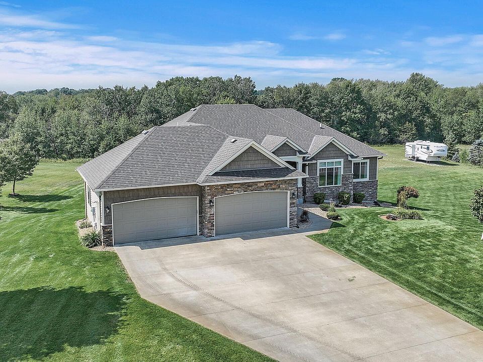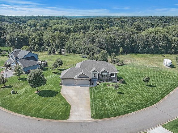 Discover the charm of this exceptional Sharper built rambler situated on a spacious 4.2-acre lot! Nestled in a tranquil cul-de-sac, this home boasts a 4-car attached heated garage complete with floor drains. The main level features three inviting bedrooms, enhanced by a striking vaulted ceiling that creates a truly grand living space. Step outside onto the expansive deck, perfect for savoring a morning cup of coffee or unwinding with a cold drink as the day comes to a close. The basement, finished in 2019, adds another dimension to the home with an additional lower level bedroom, craft room or office and a beautifully designed wet bar for entertaining guests. Key updates include a new roof in 2023, a suite of new appliances installed in 2019, and stylish Hunter Douglas window fixtures added throughout the home in 2018. New siding and downspouts in 2024! This residence is a testament to quality and attention to detail. This home does not disappoint! Your dream home awaits!