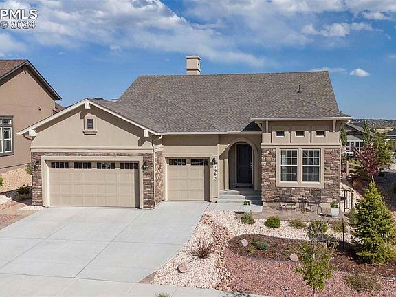 Beautiful ranch home with a three-car garage and amazing views of Pikes Peak! Located in northern Colorado Springs, this four-bedroom three bath home is in the perfect location! This property offers a harmonious blend of modern amenities and natural beauty being near Black Forest Regional Park, Airforce Academy, shopping, dining, and the two golf courses at The Club at Flying Horse. As you approach, you’re greeted by a meticulously xeriscape front yard, front patio sitting area with lovely views of the mountains. Step inside and be welcomed in with engineered hard wood flooring and ten-foot ceilings to the great room with stone surrounding gas fireplace. The eat-in kitchen is a cook’s delight with granite counters, large center island, subway tile backsplash, and stainless-steel appliances. Relax and retreat in the main floor primary bedroom with private five-piece bathroom featuring tile flooring, granite counters, walk in closet, and access to the laundry room. The main floor also includes a dining room, secondary bedroom, and full bathroom. Venture to the basement to find a large recreational room, two bedrooms with walk-in closets, and a full bathroom. No need to worry about storage with the basement offering a huge unfinished storage area and the three-car garage. Bring the entertainment outside with this huge, landscaped backyard featuring a partially covered patio, privacy fence being the perfect location for a hot tub, garden beds, grassed area, and view of Pikes Peak! Find commuting easy being conveniently located near I-25. You don’t want to miss the opportunity to own this beautiful ranch home with a three-car garage!