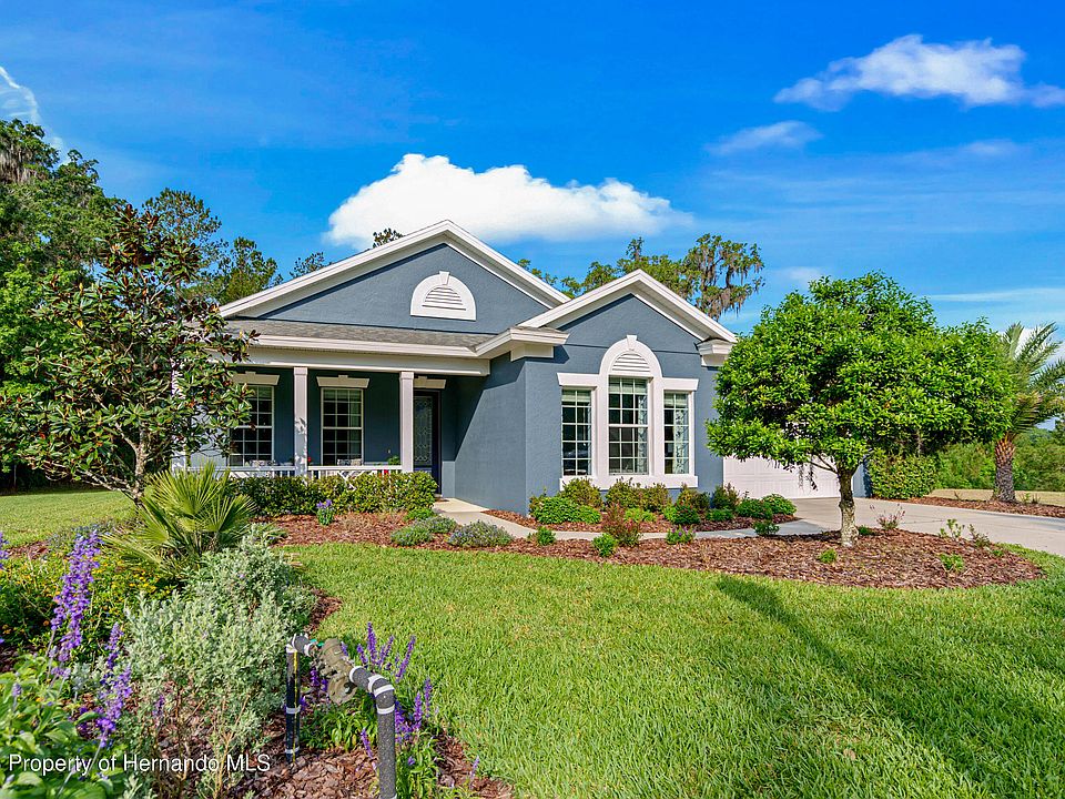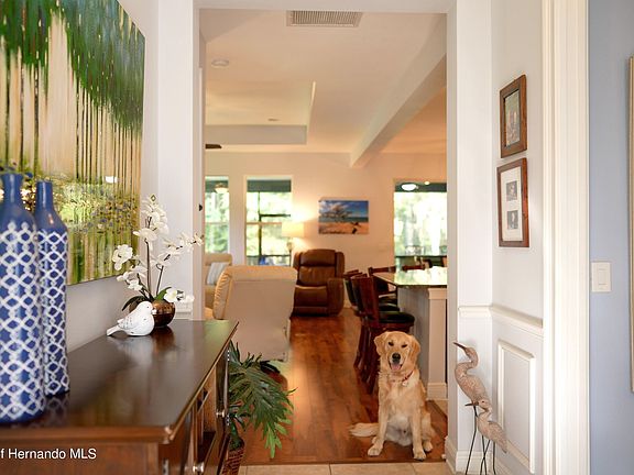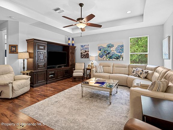 Full of character with tasteful details, this 3/2/2 custom home with extra flex room, has so much to offer, such as tray ceilings with recessed lighting, modern fixtures, wainscotting, functionally laid out open concept floor plan, and a gourmet kitchen. This 2,200 sq. ft. home on the far end of a quiet cul-de-sac sits on over .4 acres and is warm and welcoming and well appointed. The kitchen offers a large island with a deep undermount kitchen sink, granite countertops, stainless steel Kitchen-Aid appliances including a gas stovetop, and a large corner pantry. It is perfect for entertaining as it opens to both the dining and living area. The master bedroom with its en-suite bath has a separate shower and soaking tub and two separate sinks. The laundry room is spacious and comes complete with plenty of cabinets and a single bowl under-mount sink. Both guestrooms are ample size allowing for a variety of options. The extended screened-in lanai with pavers adds an outdoor living space, a summer kitchen, and an area for relaxing and taking in the beautiful views of your landscaped yard. HOA includes cable and internet, lawn maintenance, irrigation and more. Southern Hills is Hernando County's premier golf course community offering resort style pool, fitness center, Har-Tru tennis courts, brand new pickleball courts, and formal and informal dining. Additionally featuring a par 3 walking course, putting green, driving range and pro shop. Host to multiple PGA qualifying events and member tournaments. Conveniently located 40 minutes from Tampa International Airport, shopping and restaurants. Call to schedule your private tour today!