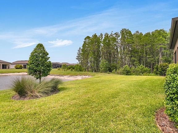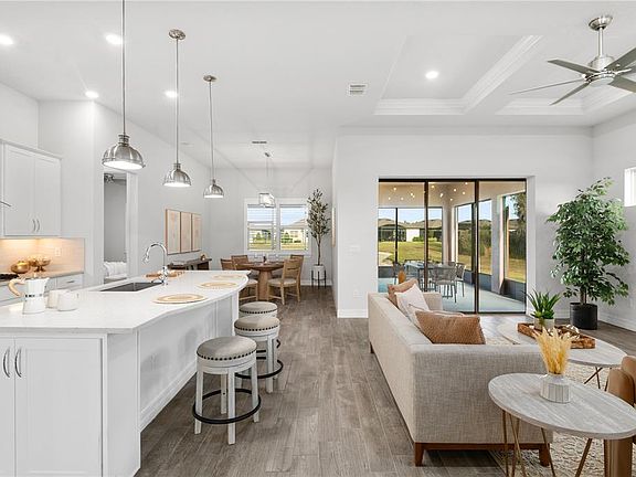 Nestled in a tranquil setting, this stunning property offers breathtaking water views from both the back and side of the home, providing a serene and picturesque backdrop for everyday living. Welcome to this beautifully appointed 3 Bedroom + Office, 2 Bath Home with a 2-car garage, perfectly situated on a serene pond in the gated 55+ community of Del Webb Bexley offering resort-style amenities. From the moment you step inside, you’ll notice the elegant wood-look tile flooring and plantation shutters that run throughout the home, creating a cohesive and upscale feel. The spacious kitchen is a chef’s dream, featuring crisp white cabinets, stunning quartz countertops, stainless steel appliances, a large island with seating and pendant lighting, subway tile backsplash, a vented range hood, and a generous sized pantry. The adjacent dining area boasts water views, making every meal a relaxing experience. The family room is equally inviting, complete with crown molding and sliding doors that open to the backyard, where tranquil pond views await. The primary suite is a peaceful retreat with a tray ceiling, crown molding, and pond views, plus an en suite bath that includes double sinks with quartz counters, a stall shower, large walk-in closet, and a linen closet for added storage. French doors lead into the office, which also offers beautiful water views—perfect for quiet work or reflection. The guest bath includes a tub/shower combo for versatility. Outdoor living is a dream with the expansive wrap-around, covered, and screened patio—ideal for entertaining or enjoying peaceful mornings by the water. The community amenities are plentiful! Relax in the heated swimming pool, resistance pool and spa. Stay active with tennis, pickleball, and bocce ball. The 19,000 sq ft Clubhouse hosts various events, activities and clubs and is home to the state-of-the-art fitness center and much more. Take advantage of the dog park, on-site bistro, and outdoor amphitheater. This home is the perfect blend of luxury, comfort, and active adult living.