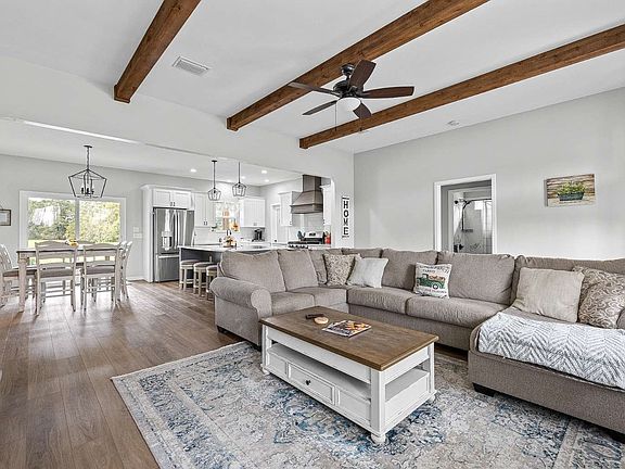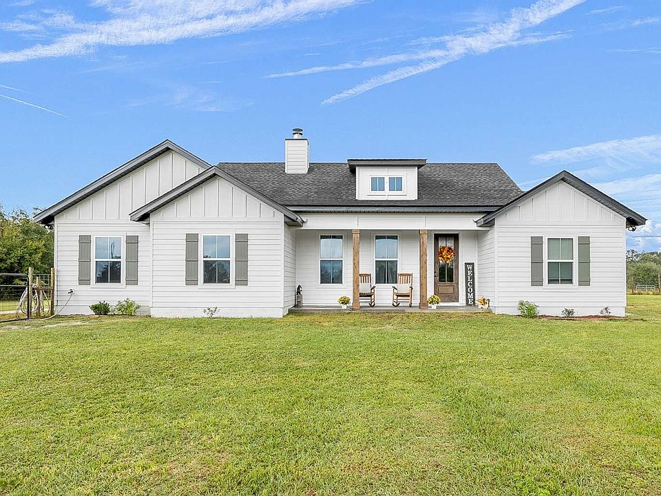 This beautiful property boasts an immaculate 3 bedroom, 2 bathroom house situated on a 6.85 acre lot. As you step inside, you'll be greeted by a spacious open floor plan with luxury vinyl plank flooring, wood ceiling beams with a cozy fireplace and welcoming atmosphere. The kitchen features a large island providing ample space for meal prep and entertaining guests next to the dining room. It features gorgeous marbled quartz countertops, white cabinets, stainless steel appliances and a walk-in pantry. Around the corner, the primary bedroom provides a sanctuary with an en-suite bathroom highlighting a decorative shower and tub. Down the hall you'll find two more generously sized bedrooms that offer ample space for family and guests. You love the convenience of the laundry room and 2 car garage. Choose which view you want outside from either the front or back covered porch. Enjoy the country lifestyle in this quiet rural setting with low traffic, surrounded by hay fields and well suited for horses and equestrian uses. It's a peaceful retreat away from the hustle and bustle of the city while being conveniently close to amenities such as schools, shopping centers and restaurants. Outdoor enthusiasts will appreciate living close to 30 minutes from well-known springs such as Ichetucknee Springs, Blue Springs and Ginnie Springs. Schedule a showing today and imagine yourself enjoying the tranquility of 19653 57th Road!