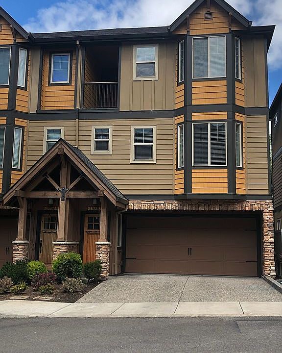 Like new, end-unit townhome in gated community. Features luxury finishes throughout, bamboo floors, high ceilings. Upper level has 3 bedrooms, incl bedroom suite with private deck. Main level features gorgeous kitchen with all SS appliances, quartz counters, custom alder cabinets. Dining rm has slider to upper deck. Living rm has stone finish fireplace & bay windows. On lower level is 4th bedroom suite w slider to covered patio. Plenty of parking, community playground, close to MAX and busline.