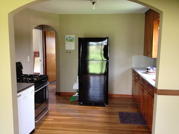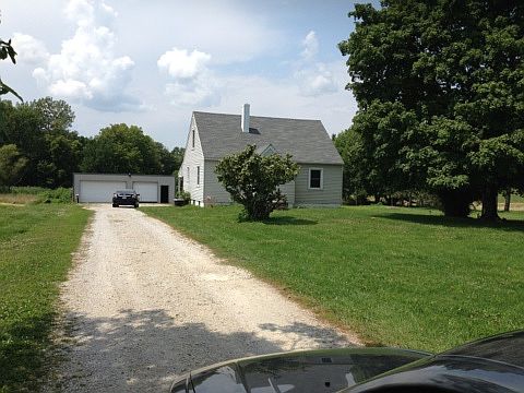 Quiet country living just outside of town with one large bedroom upstairs with huge walk in closet, second bedroom and one bath on main level. Central heating and air, includes stove, refrigerator, and dishwasher, with large three car garage and big yard. Property has city water.