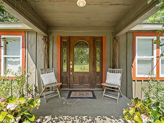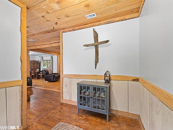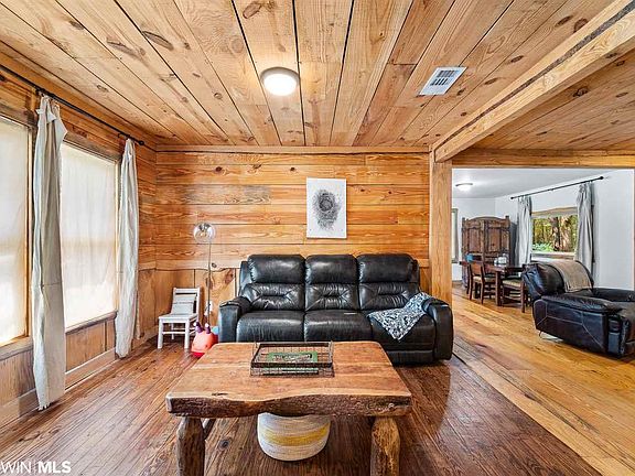 Looking for RUSTIC CHARM on an acre of land in a convenient location? Then this country farmhouse is for you! There is nothing cookie-cutter about this beautiful home. With hardwood throughout, you'll find one of a kind, custom Baldwin County pine floors and raw edge Baldwin County pine trim adorning the door frames, windows, and even around the shower. The spacious living room features a striking stone clad wood burning fireplace and custom mantle that will keep you warm on cold winter nights. An extra-large window in the kitchen lets in lots of light and showcases the raw edge pine trim. The kitchen opens to the dining area and living room. The home was totally renovated in 2013 by Baldwin County legend Kenny Horton. 2013 upgrades include new wiring, plumbing, HVAC, metal roof, custom floors, ceilings, insulation, hurricane windows, wood burning fireplace, and 2 screened porches. The home features 2 bedrooms/1 bath with an office or bonus room. The 1-acre yard includes mature trees such as shady, idyllic live oaks. Numerous flowering plants adorn the property including large gardenia bushes, irises, day lilies, hydrangea, peonies, daffodils, ginger lilies, and a beautiful confederate jasmine vine that will have you wanting to relax on the front porch and smell the sweet flowers again and again. There is also a fig tree, pecans, and a muscadine vine. Unwind on either of the two screened in side or back porches and enjoy privacy as you take in the view of the fenced in yard surrounded by vegetation and greenery. Located in quaint Silverhill, but only 4.2 miles from Fairhope Walmart. Buyers can enjoy the quiet country life with quick and easy access to the famed Fairhope Pier, shopping, restaurants, and more! The former single car garage is enclosed and is being used as a large storage space. A few small sheds give the gardener or craftsman a lot of space for tools. Plenty of space to park on the acre lot. No HOA restrictions or fees!