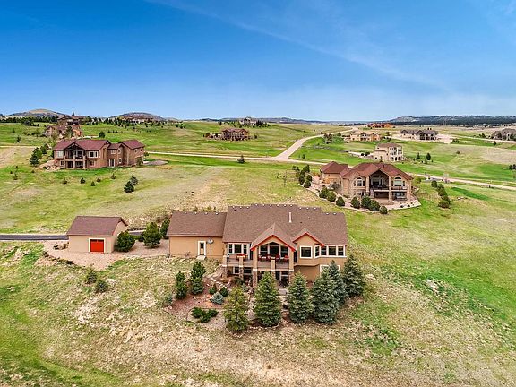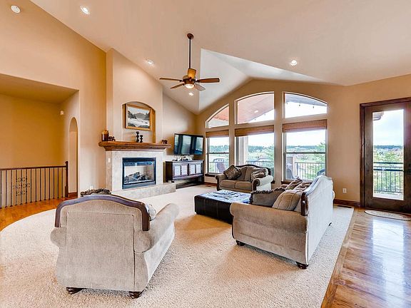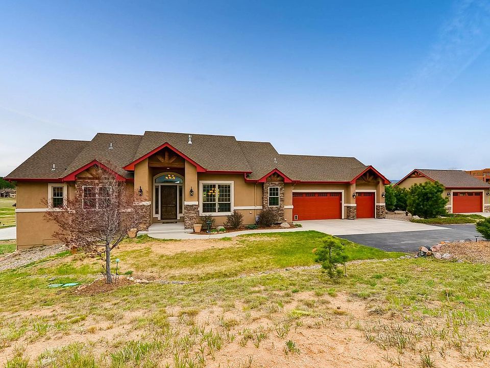 Wow! Custom built luxury with that coveted casual Colorado style. Gorgeous sprawling single story home designed for both cozy family living & gracious indoor & outdoor entertaining. Big windows with spectacular vistas from every room - panoramic million dollar views of Pike's Peak, the golf course & the pond below. Vaulted great room w/curved staircase, a fireplace, gourmet eat-in kitchen w/knotty alder cabinets, an island & upgraded appliances. Formal dining room. Spacious master suite w/sitting area that opens to the back deck, 2-sided fireplace, enormous bath w/jetted tub, huge 2-headed shower, incredible walk-in closet & private WC. Study off the front entry. Huge walk-out basement with a rec room (the pool table, the bar, bar frig, both TVs and surround sound system all stay), a 3rd fireplace, 3 more bedrooms & 2 full baths. Custom solid wood doors throughout. Main level covered deck w/patio below. Attached 3 car garage + separate 2 car version for a shop or to store the toys.