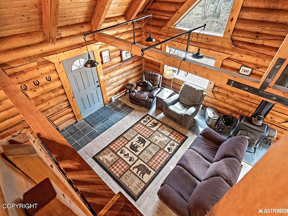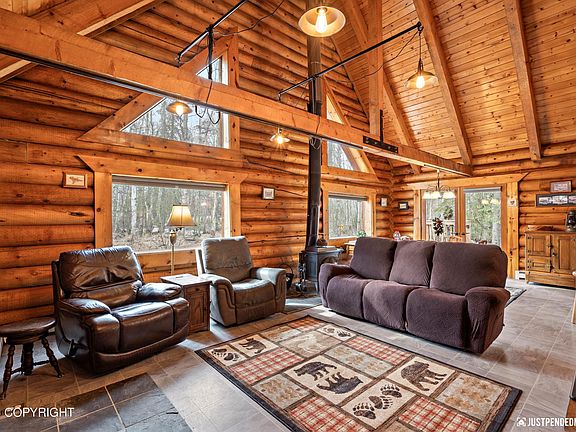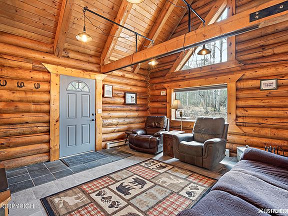 Welcome to your dream retreat! This impeccably built and well-maintained ''Rocky Mountain Log'' home sits on over two acres of prime real estate in Chugiak, just 18 minutes from JBER. The fully fenced, wooded lot features two convenient entrances, ample space for parking RVs and recreational toys, and a large wrap-around deck that's perfect for outdoor entertaining.Step inside to find a warm and inviting living room with vaulted ceilings and a cozy wood stove the ideal setting for relaxing on chilly evenings. The updated kitchen boasts stylish painted cabinets, butcher block countertops, and stainless-steel appliances, making meal prep a pleasure. Two bedrooms with new flooring and a remodeled full bathroom complete the main floor. Head upstairs to the loft that overlooks the living and dining areas, where you'll find the spacious main bedroom. This suite features vaulted ceilings, two roomy closets, and a beautifully remodeled bathroom. New blackout blinds in all bedrooms. Additional upgrades include a new roof in 2023, a Bosch hot water heating boiler, and new interior and closet doors. Newer light fixtures. Custom cedar shelving in the loft/office provides both functionality and charm. Outside, the detached two-car garage offers ample storage, complete with an additional 528-square-foot studio above. The studio is wired for electricity and has a new rebuilt staircase and landing, offering potential for extra storage or future living space. New wood shed (8 x 16) with metal roof and wood decking. Don't miss this unique opportunity to own a slice of tranquility with all the modern conveniences you need. Schedule your showing today and experience this one-of-a-kind property for yourself!